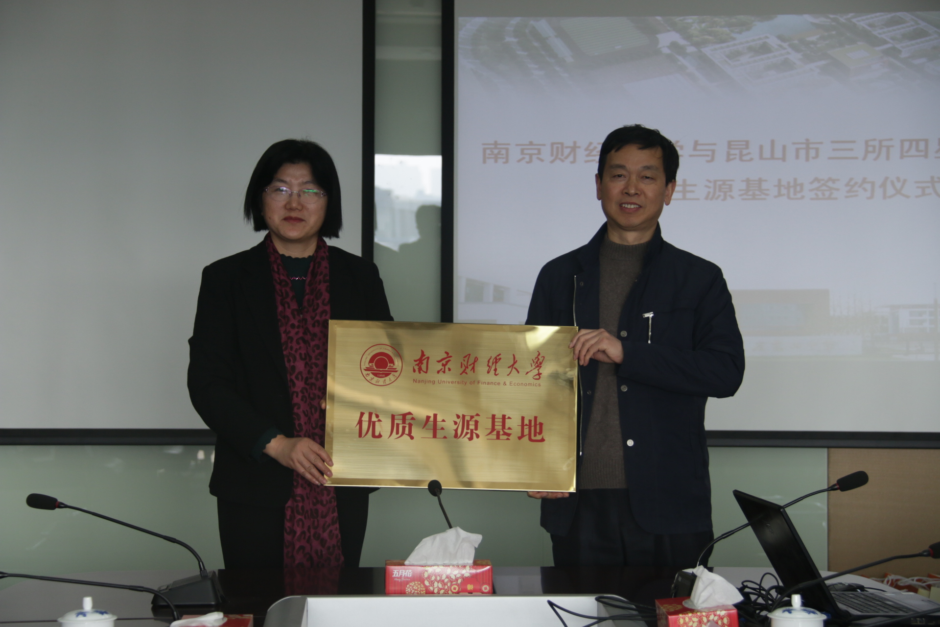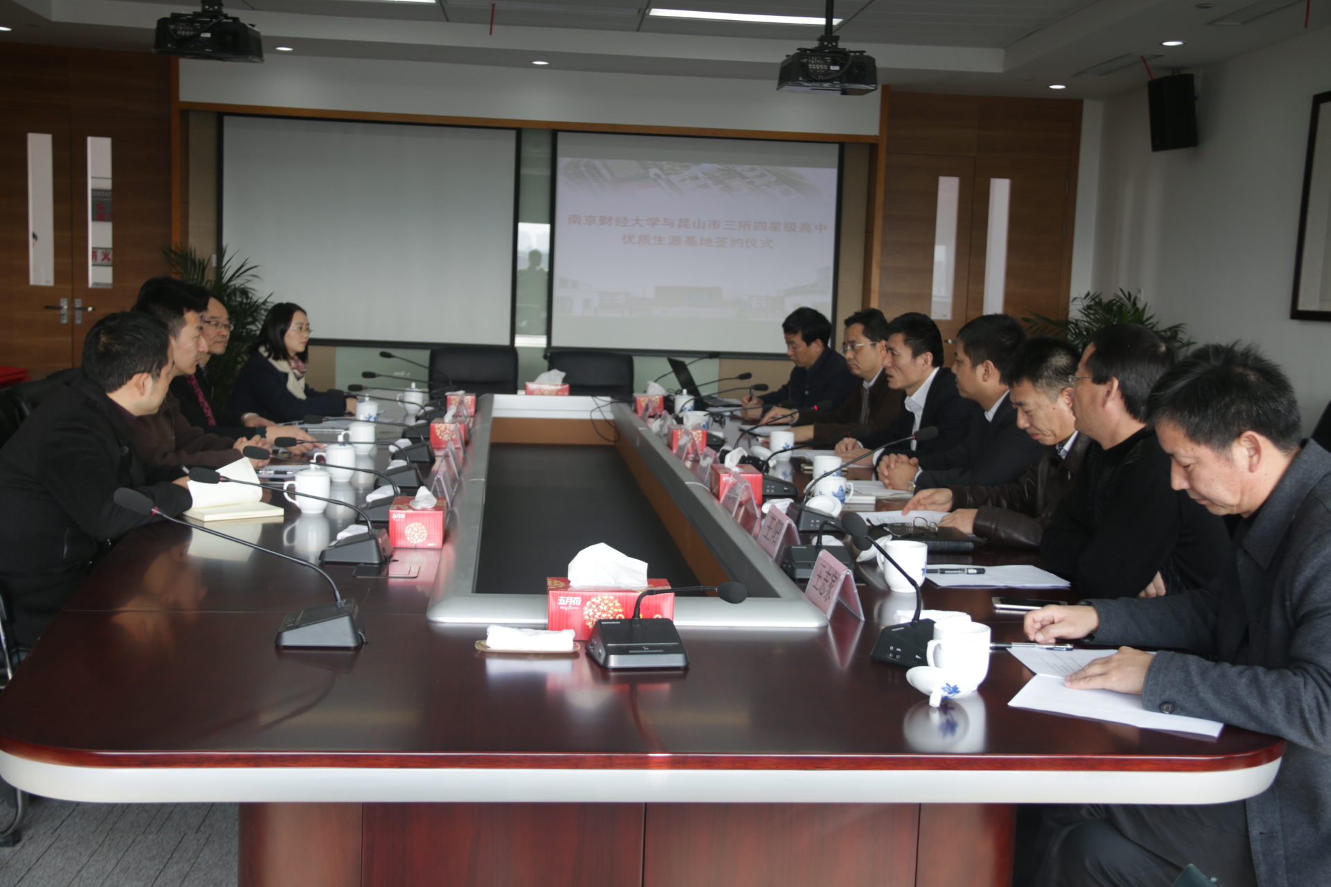 会上,邱伟芬副校长授予三所四星级中学“优质生源基地”铜牌,姚学峰处长与江苏省昆山中学校长徐晓林、昆山市震川高级中学校长王阳、昆山市第一中学校长王志家等分别签订了“优质生源基地”合作协议书。