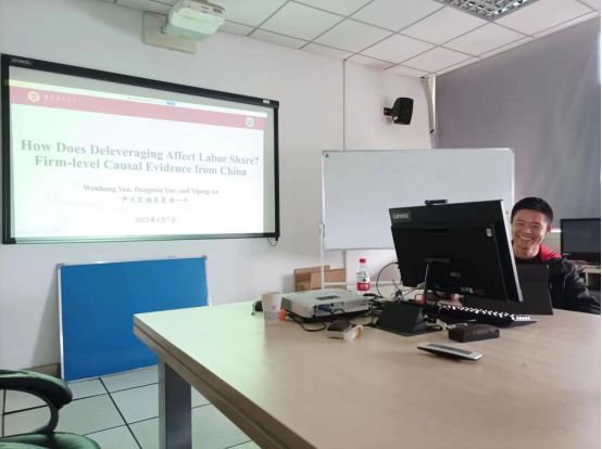 2023年4月7日中午,我院举办“支部之家·财税教研论坛”(第二期),税务系教师赵焱博士在公共财政研究中心作了题为“How Does Deleveraging Affect Labor Share? Firm-level Causal Evidence from China”(《去杠杆是如何影响劳动收入份额的——来自中国企业层面的因果证据》)的学术报告。论坛由叶兵老师主持,部分师生参加本次讲座。