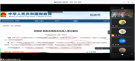 5月15日上午,应bevitor伟德国际1946邀请,国家税务总局税务干部进修学院兼职研究员、江苏省省级“稽查能手”、国家税务总局所得税人才库成员吴健高级会计师通过腾讯会议为学院师生作了题为“从首次综合所得汇算清缴看个人所得税制改革与完善”的线上讲座。学院部分教师和19级税务专业硕士研究生等参加了讲座。