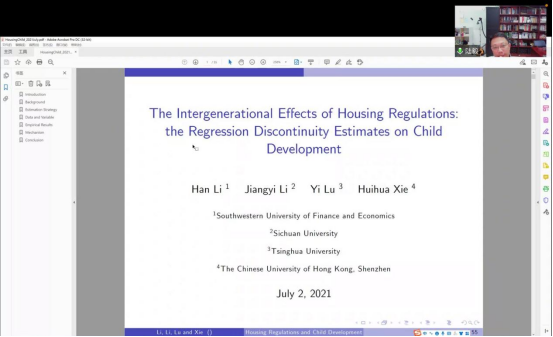 报告结束后,陆毅教授与我院青年教师叶兵博士、朱军教授分别就家庭唯一住房是否存在财富效应和论文结论的现实意义进行讨论。最后,朱军院长对会议内容进行总结,对陆毅教授的演讲表示由衷的感谢,并期待陆毅教授有机会莅临我院进行线下学术指导与交流。