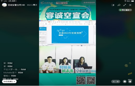 活动主要分为线上参访和线上答疑两个环节。线上参访环节中,容诚会计师事务所的工作人员通过直播的方式向同学们全方位地展示了容诚会计师事务所舒适的工作环境,装修精良的前厅、宽敞明亮的会议室、干净整洁的工作台,同学们深深感受到知名企业的企业文化和人文关怀。接着,工作人员为他们详细介绍了会计师事务所的业务模块,使得同学们了解会计师事务所的业务构成和岗位工作内容,树立明确的就业目标。最后,工作人员公布了容诚会计师事务所校招时人才选拔的标准和多种多样的职位申请渠道,激励着同学们以会计人才选拔的高要求严格锻炼自己。随后的线上答疑环节,同学们自由在直播评论区进行评论,由事务所的工作人员解答疑问。“能再详细说说实习期的问题吗”、“如何分配部门”、“想问一下之前的‘容耀生’计划”、“请问应用统计有可投岗位吗”……容诚会计师事务所的工作人员对每一个问题都做出了详细的回答,最后还送出了5张面试直通卡,为同学们提供暑假实习的机会。