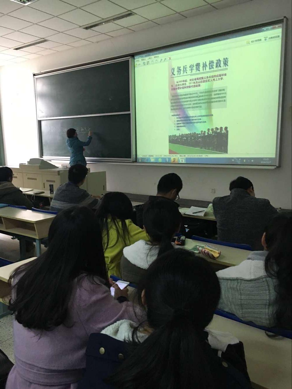 2016年3月20日,bevitor伟德国际1946在专二117教室举办义务兵学费补偿政策宣讲会。学院邀请熟悉义务兵学费补偿政策的辅导员李玲老师作政策宣传,为有志穿上戎装、献身国防的大学生提供政策支持。