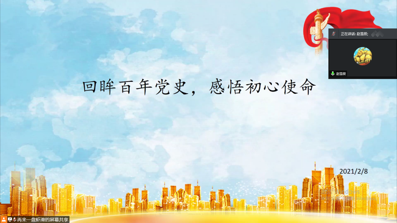 辅导员们首先由党史的发展脉络及重大意义入手,引导同学们初步了解党史,深入认识学习党史是加强党的思想理论建设的重要任务,是继承党的成功经验和优良传统的需求。随后,辅导员们进一步表示在学习党史的同时,我们也不能缺少对时势的关注。当下,我国疫情趋势虽然向好,但我们仍不能松懈,抗击疫情应当始终牢记党的初心和使命,加强疫情防控这根弦不能松。班会最后,辅导员们祝福同学们新春快乐,并嘱咐大家利用好寒假时间,认真思考自己的未来。