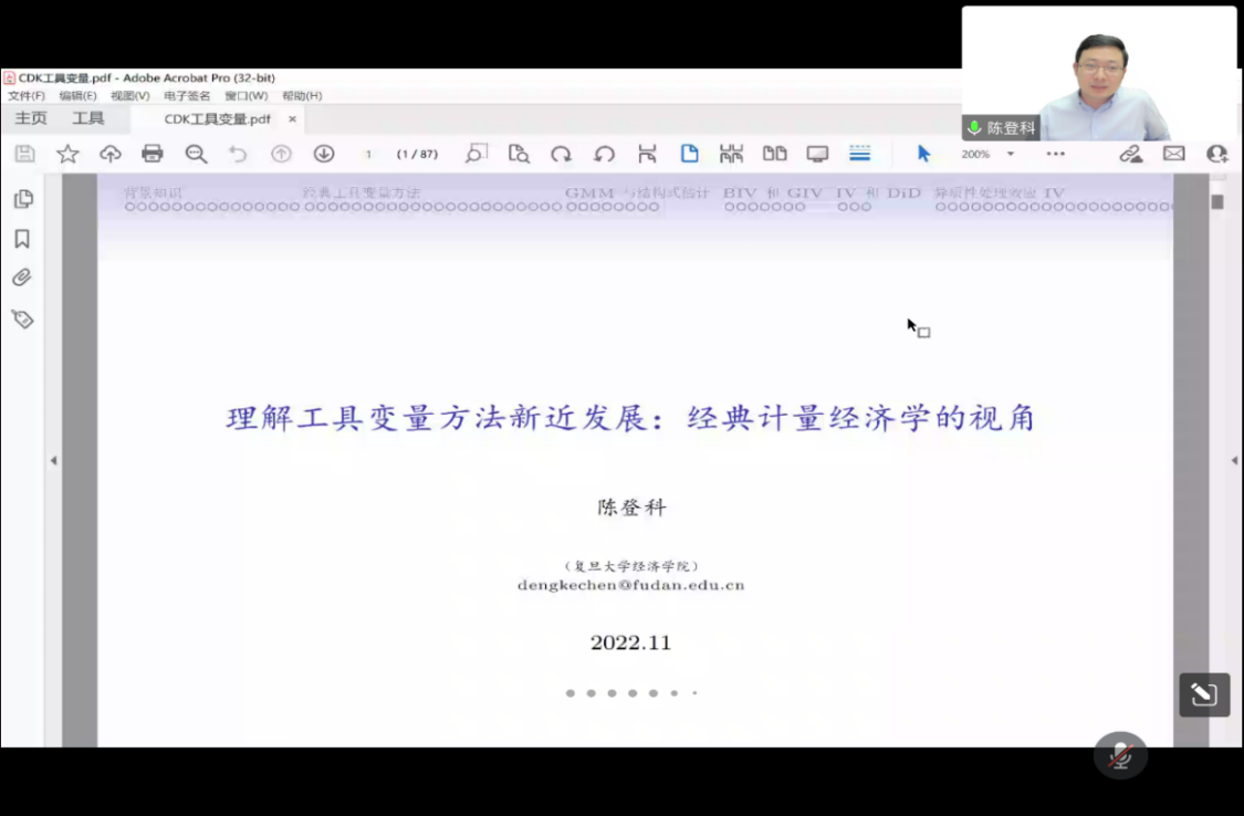 11月10号晚,bevitor伟德国际1946“财税青年讲坛”邀请复旦大学经济学院研究员陈登科博士作了题为《理解工具变量方法新近发展:经典计量经济学的视角》的线上学术报告。本次讲坛由学院院长余泳泽教授主持,我院部分师生、一些兄弟院校的老师等140余人参加。