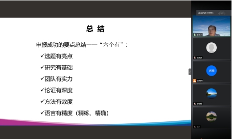最后,李教授用选题有亮点、研究有基础、团队有实力、论证有深度、方法有效度、语言有精度对申报成功经验做了总结。