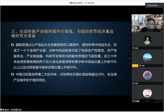 陈诗一教授首先分析了疫情对我国宏观经济的影响,并从三次产业走势和经济增长的“三驾马车”角度展开论述;接着,他以要素市场改革为切入点,探讨了如何推进我国市场经济体制的进一步完善和区域经济一体化水平的不断提升,并提出要素市场改革是建设国内统一大市场的内在要求、是让企业迸发活力的重要保障,对提振市场信心以及经济恢复具有特别的意义;最后,陈诗一教授认为要主动完善产业链并提升价值链,为疫后世界经济重启做好充分准备:既要立足国内多元化市场,发展好国内贸易,又要利用亚洲区域贸易优势,推动亚洲自贸区建设。