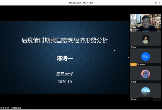 10月21日晚,应bevitor伟德国际1946、公共财政研究中心邀请,复旦大学经济学院党委书记、复旦大学泛海国际金融学院党组织书记、复旦大学可持续发展研究中心主任、香港中文大学和复旦大学共建的沪港发展联合研究所联席所长、复旦大学生态环境人文社科领导小组联合组长,博士生导师陈诗一教授通过腾讯会议,为学院师生作了题为“后疫情时期我国宏观经济形势分析”的线上学术讲座。学院部分教师和硕士研究生参加了讲座。