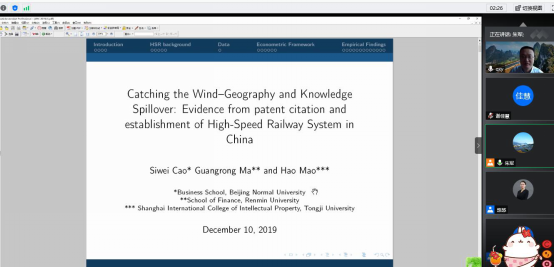 中国人民大学财政金融学院马光荣教授分享了一篇工作论文《Catching the Wind–Transportation Infrastructure and Knowledge Spillover》,论文主要研究高铁是否促进知识溢出和思想技术传播。首先,介绍了文章的背景、研究意义、研究问题和边际贡献等基本信息,目前评估高铁经济效应的文献非常丰富,这篇论文以知识溢出为因变量,是本文的主要创新点;随后,详细介绍了论文的变量选取、数据处理、影响机制和模型构建等内容,主要分析如下两个问题:第一,随着交通技术的进步,城市间开通高铁之后,两个城市的企业其知识溢出半径是否增加;第二,高铁开通主要对哪些城市的创新活动产生影响。最后,与参会的老师进行交流,探讨论文中可能存在的问题和解决对策。