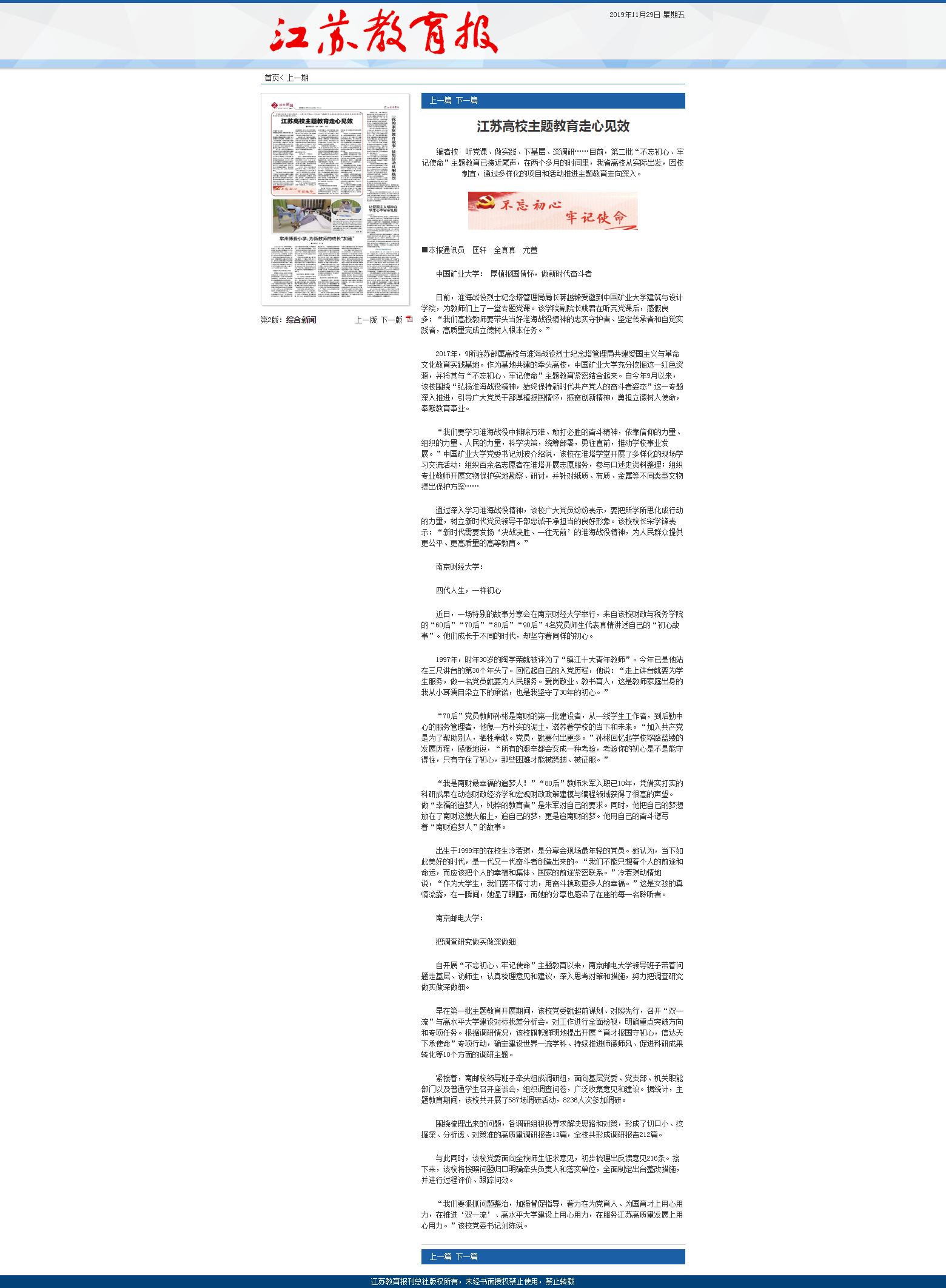11月29日《江苏教育报》第二版,刊登了题为《江苏高校主题教育走心见效》的文章,文中报道我院“不忘初心、牢记使命”主题教育“我的初心故事”。该活动,是我院党委与党校办支部联合举办的党日活动,活动分别邀请了“60”后党员代表陶学荣老师,“70后”党员代表孙彬主任,“80后”党员代表朱军教授,“90后”党员代表冷若琪同学,回忆入党经历,讲述初心故事。该活动同时还被《人民日报》等融媒体平台报道。