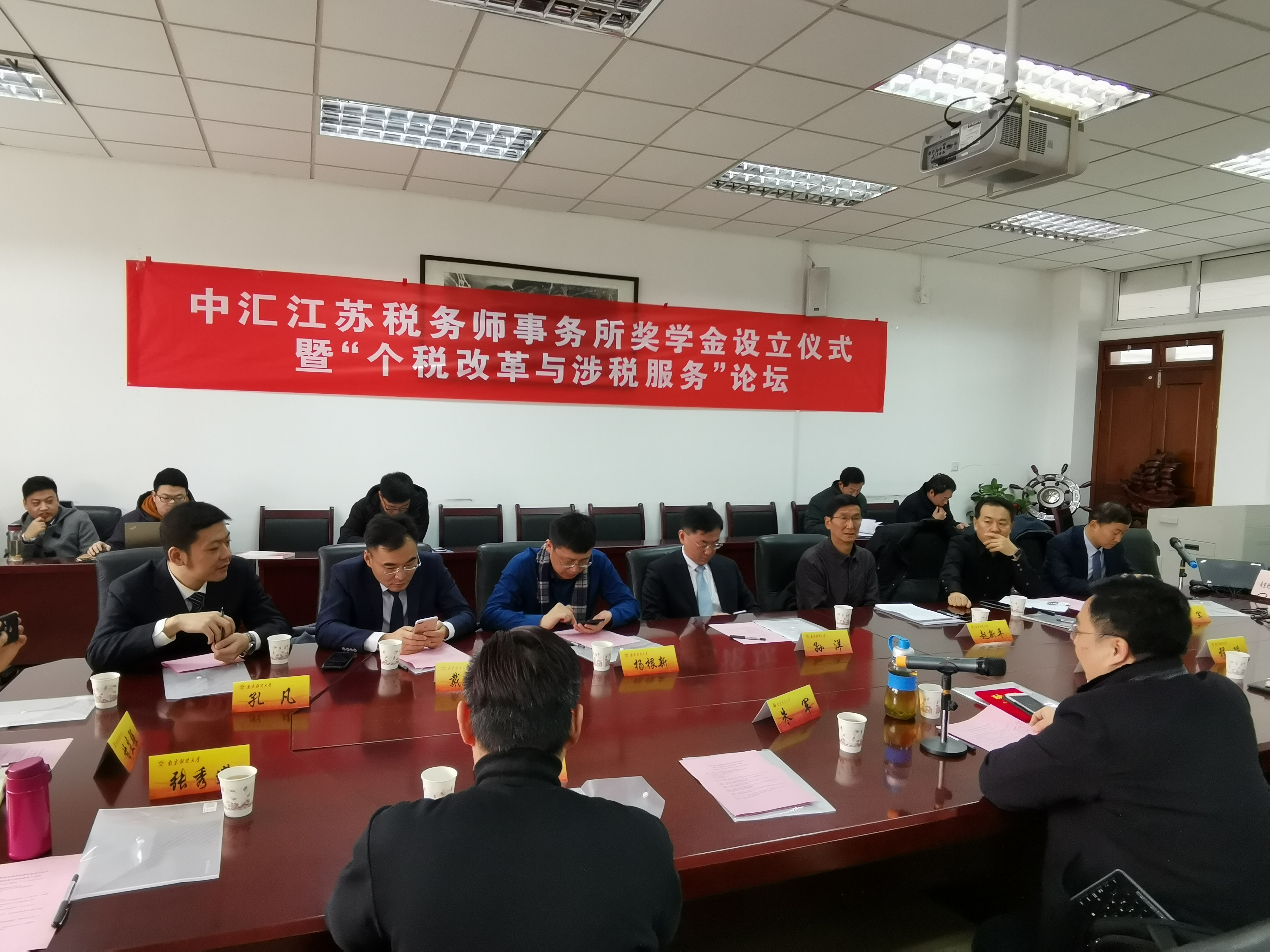 1月15日下午,“中汇奖学金”捐赠仪式暨“个税改革与涉税服务”论坛在我校仙林校区德经楼408会议室举行。江苏省注册税务师协会常务理事、原江苏国税副巡视员赵新平、中汇江苏税务师事务所董事长孙洋、伟德国际1946bv对外联络处副处长姚智谋、bevitor伟德国际1946全体党政领导、部分教师与学生参加了此次活动。仪式由副院长管永昊主持。