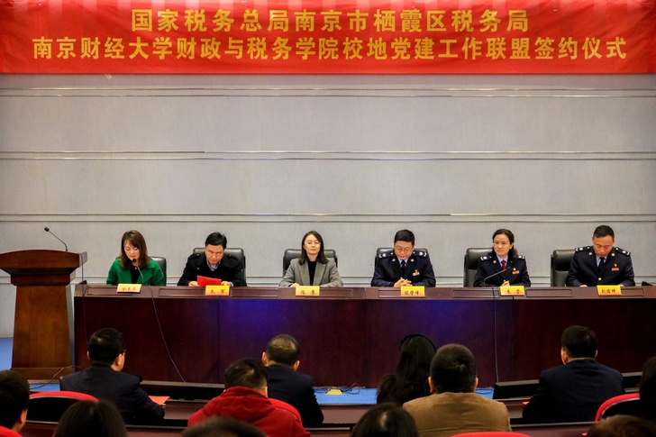 为创新基层组织建设活动形式,强化校地党建统领,实现党建资源共享、优势互补,我院党委与栖霞区税务局机关党委组成校地党建工作联盟,并于11月27日上午在仙林校区行政楼二楼报告厅举行联盟签约仪式。栖霞区税务局党委书记、局长殷壁峰,栖霞区税务局机关党委书记、副局长袁莹,栖霞区税务局机关党委副书记刘德坤,我院党委书记陈苏、副院长(主持工作)朱军,以及栖霞区税务局、学院党员代表参加了仪式。签约仪式由我院分团委书记全真真主持。