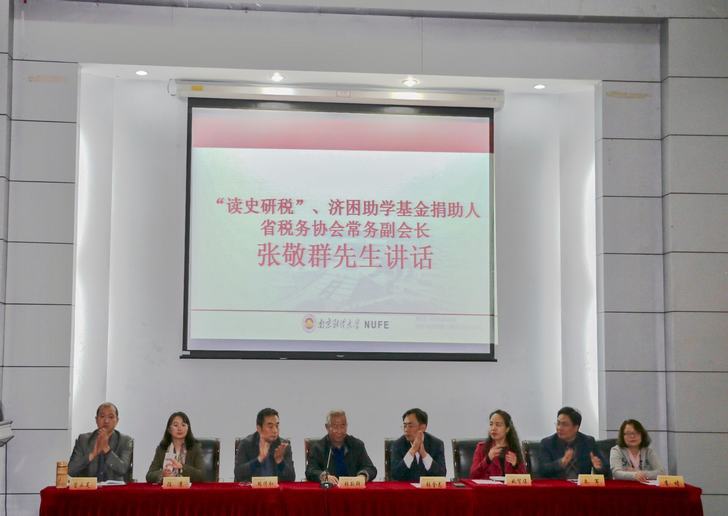 在“读史研税 济困助学基金”颁奖仪式环节,基金捐助人、省税务学会常务副会长张敬群先生发表了讲话。他对获奖学生表示祝贺并谈了自己的人生感悟,教诲在校大学生无论何时要坚持学习,要拓展多样的学习渠道,强调了财税两个专业的重要性和唇齿相依的关系。