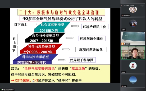 董教授围绕着“碳达峰”和“碳中和”两个关键词,结合我国的实际情况,对国际气候论坛格局及其背后所蕴含的政治经济学理论展开了精彩的阐述。